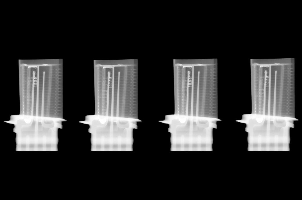 Radiography alone struggles to pick up these flaws. In order to detect even the smallest bits of leftover ceramic, the blades must be washed with a special contrast agent containing gadolinium — which settles within ceramic but washes off the rest of the blade — and subjected to neutron radiation. When a neutron image is taken in our lab, the gadolinium-soaked ceramic fragments show up on film in stark contrast to the surrounding material.