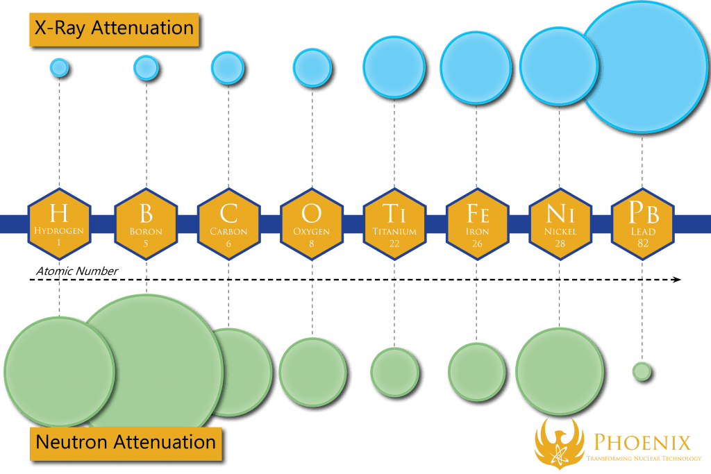 Neutrons don’t follow such a linear pattern. The only part of the atom they interact with are the extremely small nucleus, which is mind-bogglingly tiny compared to the electron cloud surrounding it. Because the ways neutrons interact with atomic nuclei are governed by a completely different set of rules, there is no easy-to-describe linear relationship between a material’s density and its transparency to neutrons. For example, some dense materials, like aluminum and lead, are very translucent, but not all of them; and some light materials, especially plastics and water, are very opaque; and here and there you have elements like boron and gadolinium that buck trends by being extremely opaque regardless of density altogether!